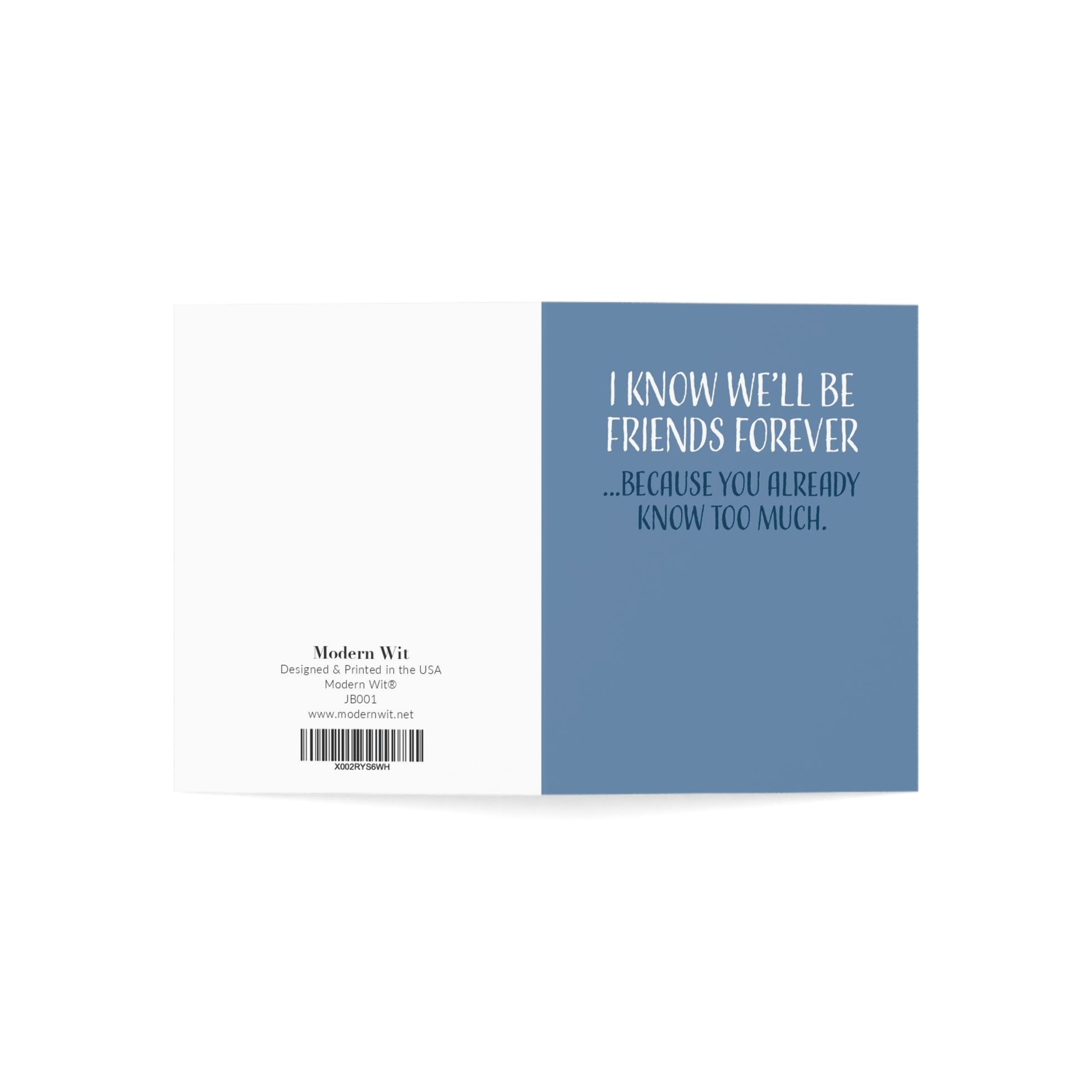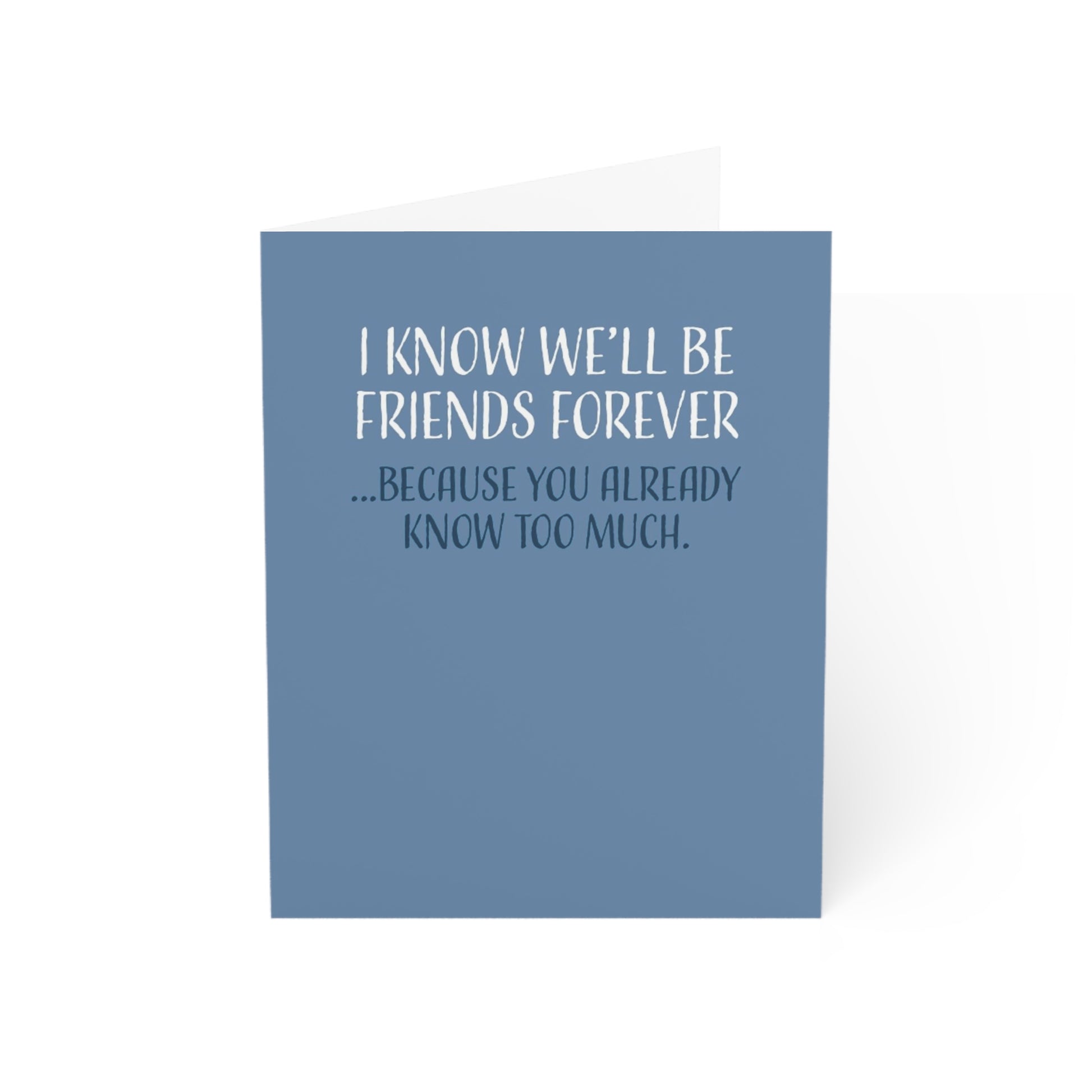 Our Friendship Card is more than just a piece of paper; it's a symbol of the deep connection and understanding between friends. With its clever and witty message, it perfectly captures the essence of your unique friendship. It's a lighthearted reminder that you're in it for the long haul because your friend already knows way too much!