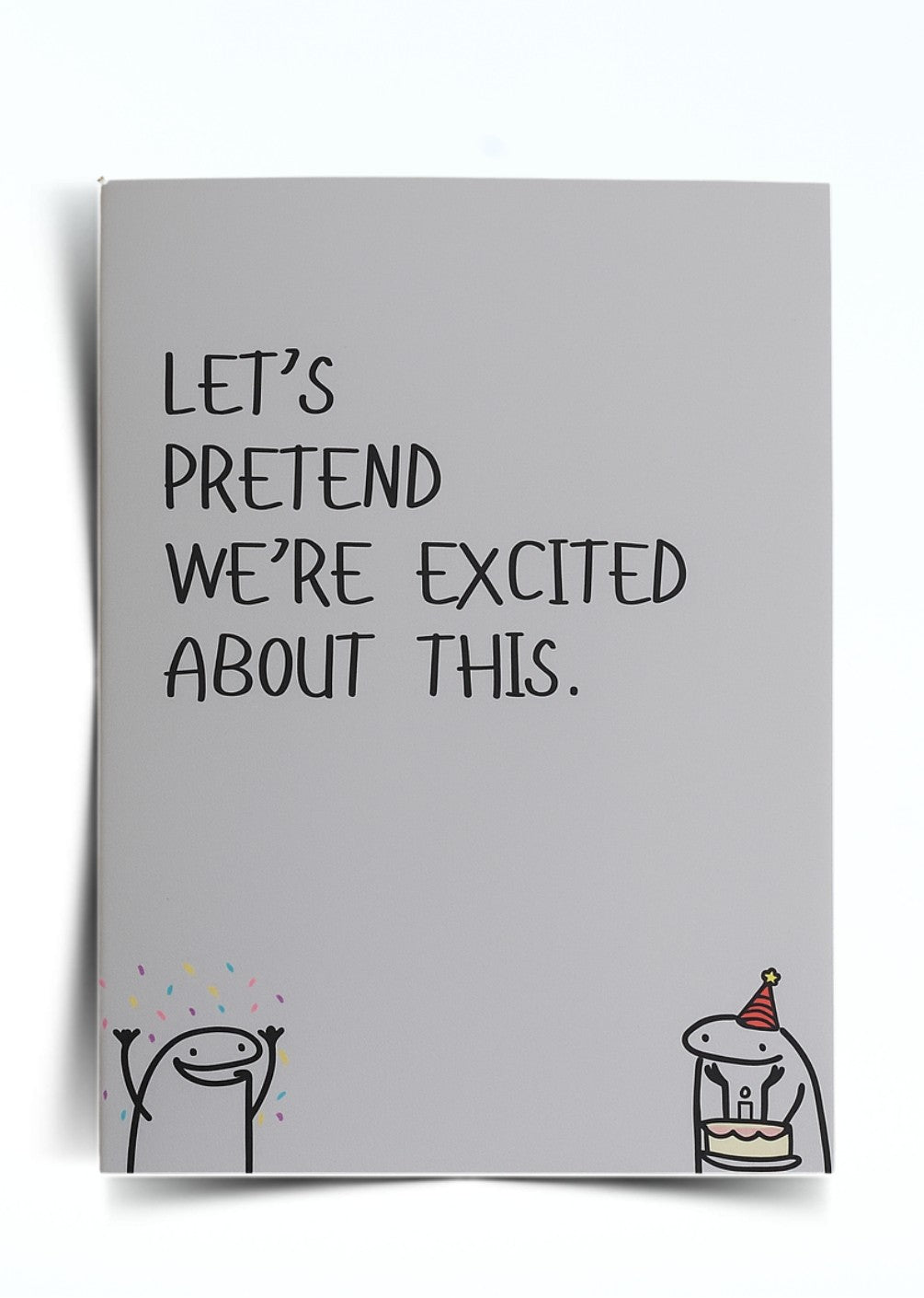 Life is full of events we’re supposed to be thrilled about—but sometimes a little sarcasm says it best. The Modern Wit® Funny Greeting Card – “Let’s Pretend We’re Excited About This.” delivers a cheeky, light grey design that’s perfect for birthdays, promotions, or any milestone that deserves a wink instead of a cheer. Printed on premium cardstock with a blank interior, this card gives you the space to write your own playful message. Whether you’re poking fun at life’s forced celebrations or making a friend laugh, this card sets the tone.